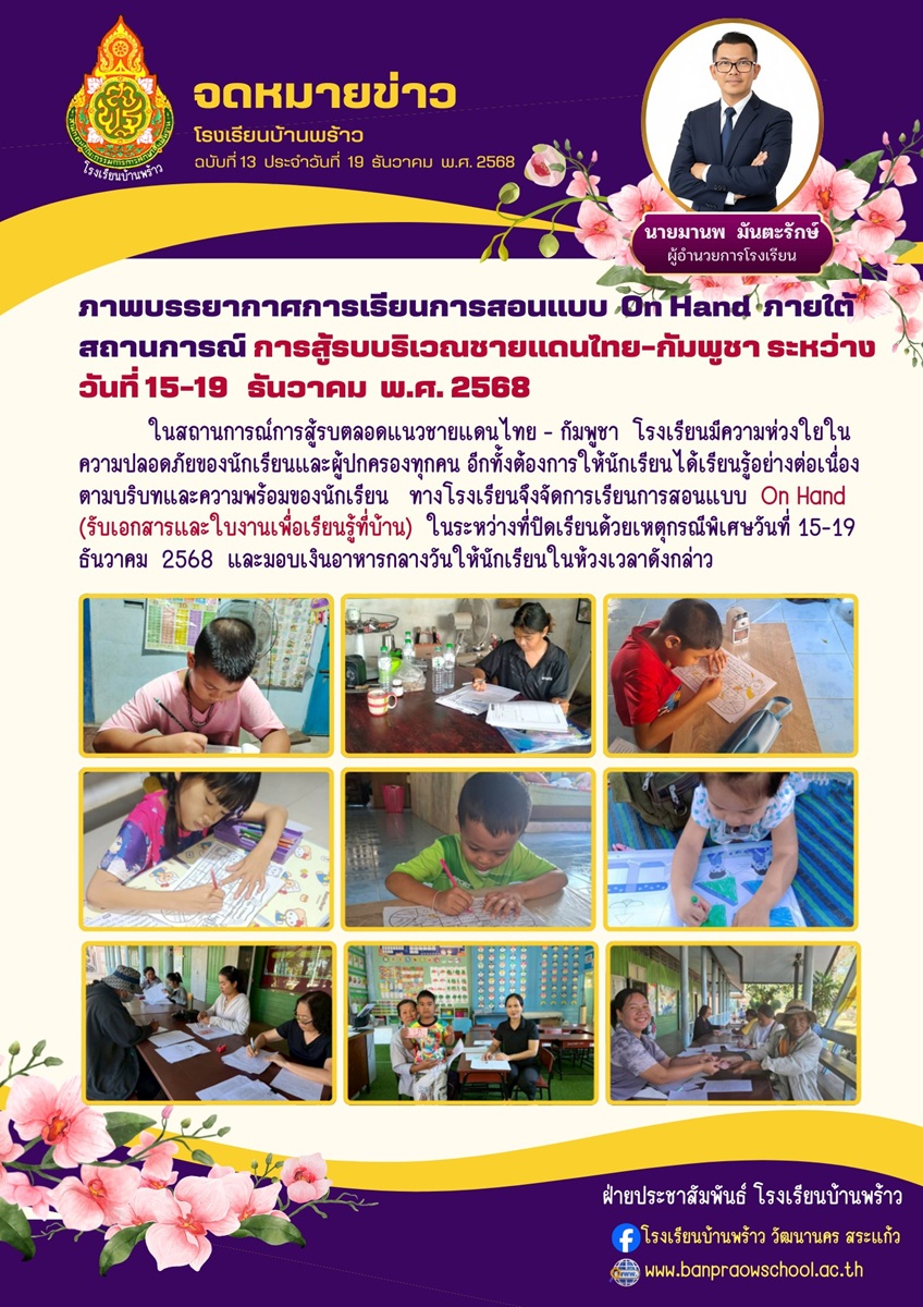 จัดการเรียนการสอนแบบ On Hand ระหว่างวันที่ 15-19 ธันวาคม 2568